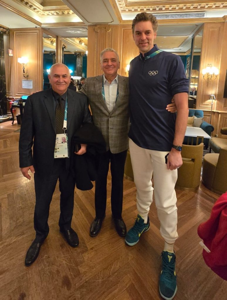 IWF President Mohammed Jalood and IWF General Secretary José Quiñones with Pau Gasol, IOC Member and Spanish basketball legend